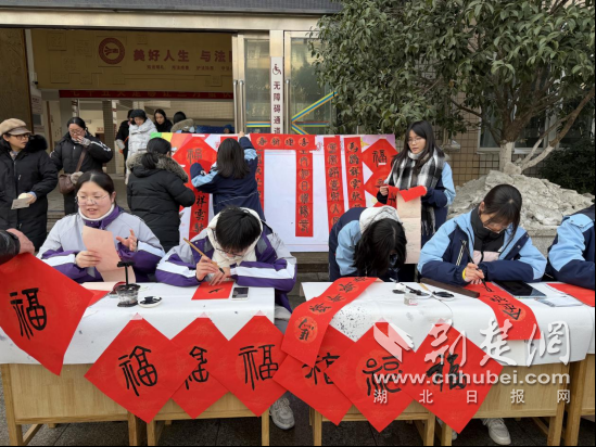 会议中途休息环节,襄阳市第二十四中学书法生开展写春联活动,为参会人员送上红红火火的祝福。同时,参会人员参观了襄阳市第二十四中学学生优秀作品展。