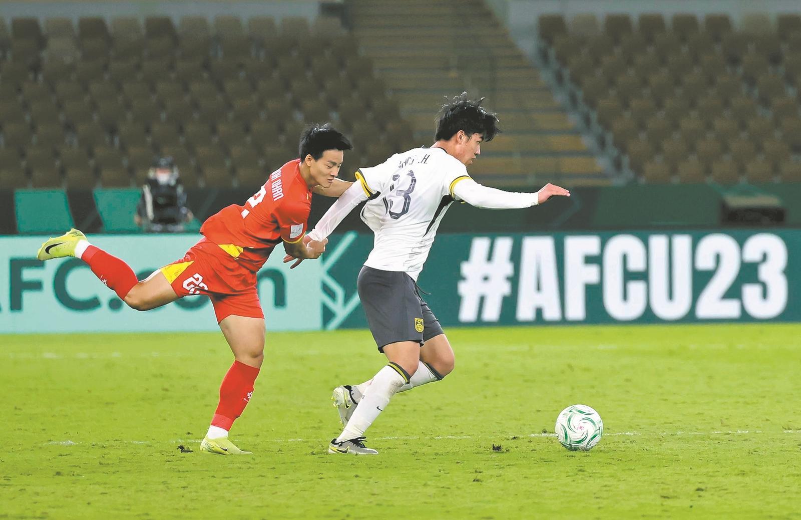 1月20日,中国队球员王博豪(右)在比赛中拼抢。当地时间1月20日,在沙特阿拉伯吉达举行的2026年亚足联U23男足亚洲杯半决赛中,中国队3比0战胜越南队,晋级决赛 新华社 发