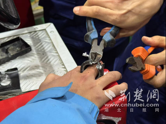 救援行动随即展开。为避免破拆工具触碰皮肤,消防员先将软铁片小心翼翼垫在学生手指与卡具边缘,形成安全防护屏障;同时安排队员持续与学生沟通,缓解其紧张焦虑。随后,液压剪缓缓靠近卡具,在精准定位受力点后,消防员稳稳操控器械,一点点对金属卡具进行剪切。由于卡具已嵌入肿胀皮肤,每一次剪切都需格外谨慎,既要保证破拆效率,又要最大限度保护学生手指。