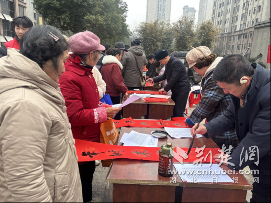 荆楚网(湖北日报网)讯(通讯员 胡博 潘堃) “过了腊八就是年,手写春联最暖心!”1月28日上午,襄阳市襄城区檀溪街道营盘社区金色营盘小区广场上红幅高悬、墨香四溢,依托襄阳市民政局“情暖襄阳”公益慈善项目,联合民福社工、襄城区文化馆、老年书画协会等单位,以“墨香传福,公益暖邻”为主题,将“营盘益家亲”品牌服务融入新春活动,为百余位居民送上“家门口的幸福”。