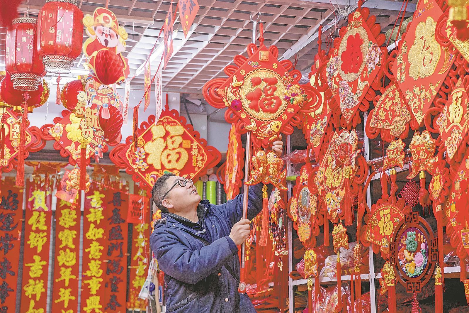 1月28日,在襄阳国际商贸城,店铺的店员正忙着整理新春饰品。襄阳各大商场的年货市场一派红火,春联、灯笼、福字等新春饰品随处可见,处处洋溢着喜迎新春的浓厚氛围。