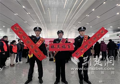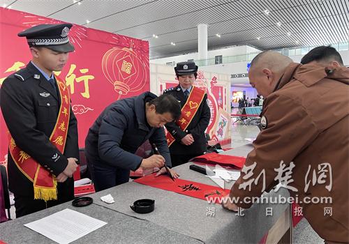 荆楚网(湖北日报网)讯(通讯员 李玉冰 秦立伟 沈雨薇)2026年2月2日,春运大幕正式拉开。为营造温馨祥和的节日出行氛围,襄阳铁路公安处襄阳东站派出所联合车站、襄阳市文联及书法家协会,在襄阳东站候车大厅共同举办了“文化列车千里行、送万福进万家”公益活动,让浓浓的年味与温情伴随旅客踏上归途。