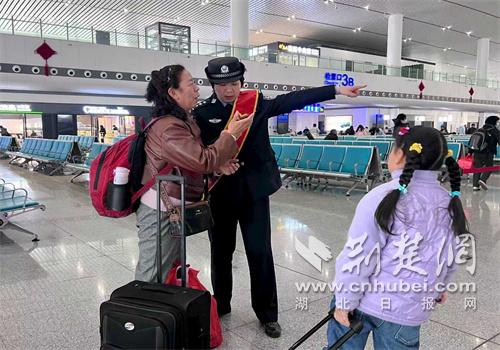 与此同时,为全力保障春运秩序,襄阳东站派出所成立“春运党员先锋队”。队员们身着醒目标识,活跃在候车厅、进出站口和站台等关键区域,主动开展扶老携幼、行李搬运、问询引导等贴心服务,并向旅客发放安全宣传资料,现场讲解旅途防盗防骗等知识,用实际行动践行“平安春运、有序春运、温馨春运”的承诺。