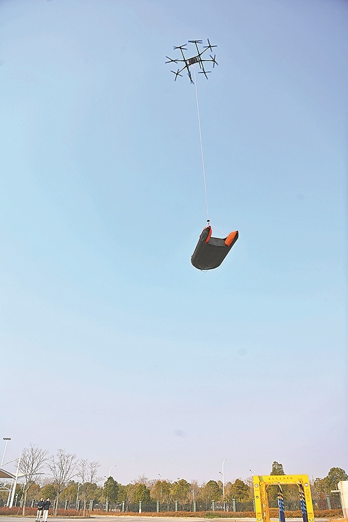 (2月4日,工作人员现场演示无人机运送抢险装备。全媒体记者 谢勇 摄)