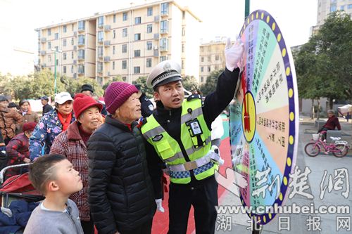 荆楚网(湖北日报网)讯(通讯员 梁政 习襄波)春节将至,2月12日下午,襄阳市公安局交管支队交警四大队联合东津公安分局六两河派出所走进东津史台社区,共同开展“交通安全有奖问答、送春联福字”主题宣传活动,将平安祝福送到居民身边。