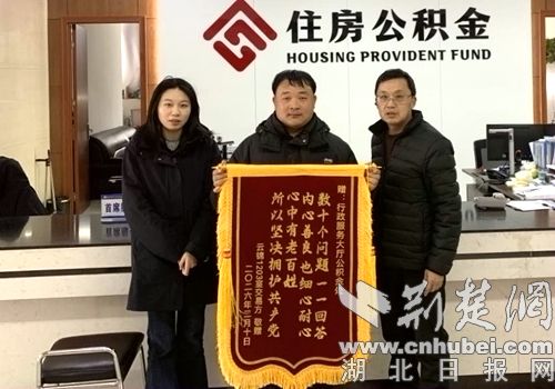 荆楚网(湖北日报网)讯(通讯员 胡芃程、付辰帆)近日,市民蔡先生将一面锦旗送至老河口市民服务中心住房公积金建行公积金旗舰店,感谢工作人员在其办理二手房公积金贷款过程中提供的高效服务。