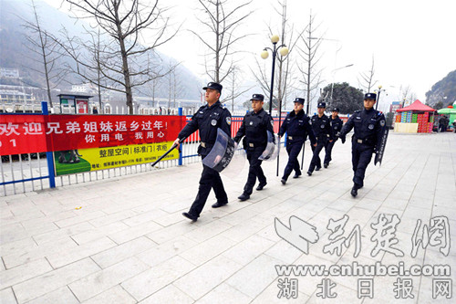 民警在保康旅游客运站安检区执勤。通讯员 供图