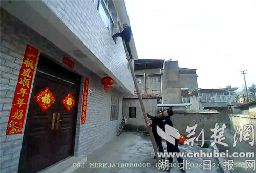 民警架梯翻窗入室救援。通讯员 供图