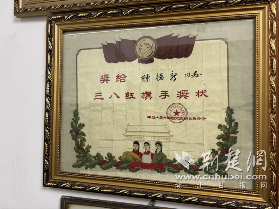 在全国“三八红旗手”陈德馨家中,客厅正中央悬挂的荣誉奖状格外醒目。这张由中华人民共和国妇女联合会授予的奖状被老人精心装裱珍藏,见证着她的奋斗与荣光。工作人员向这位巾帼榜样致敬,认真聆听奋斗历程,感悟老一辈爱岗敬业、无私奉献的精神力量。