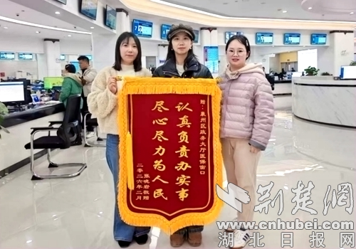 荆楚网(湖北日报网)讯(通讯员 程艳)3月9日,市民张晓岩在襄阳市襄州区政务服务中心医保窗口办理完业务后,向工作人员赠送了一面印有“认真负责办事,尽心尽力为人民”字样的锦旗,对窗口帮助其恢复医保待遇表示感谢。