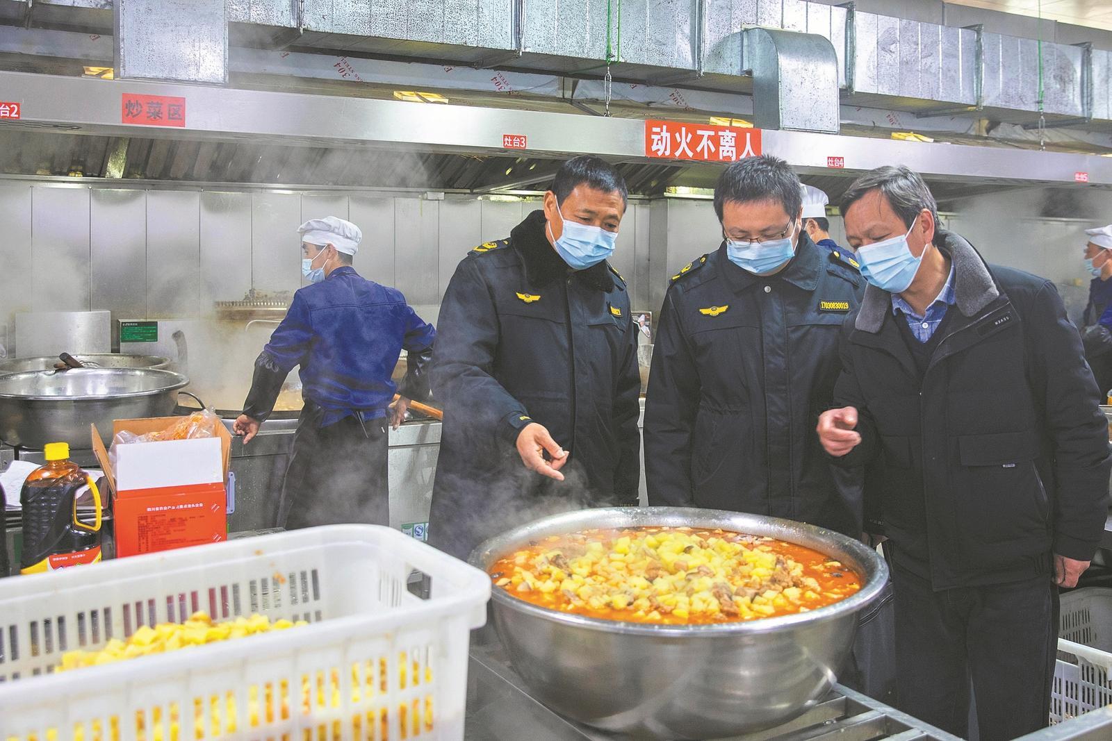 3月9日,樊城区市场监管局牛首市场监管所执法人员深入校园,对校园食品储存、食品留样、食材是否存在过期及假冒伪劣等问题进行检查,切实筑牢食品安全防线。图中执法人员正对牛首一中校园食堂的食品进行检查。