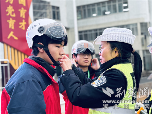 在头盔教学环节,民警亲身示范规范佩戴流程,逐一纠正头盔不系扣、佩戴不正等问题,细致讲解头盔在事故中如何发挥保护作用,让“一盔一带、安全常在”的理念入脑入心。