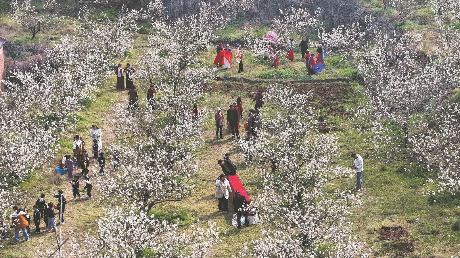 3月11日,南漳县城关镇大山村千亩樱桃花竞相绽放,吸引众多游客前来赏花。