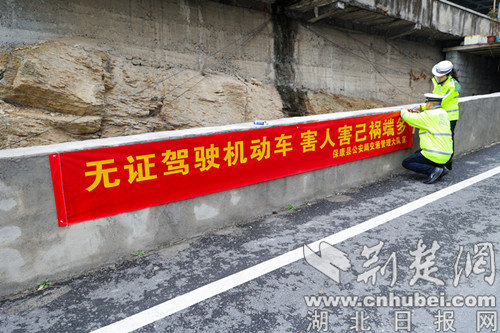 交警在悬挂交通安全宣传条幅。通讯员 供图