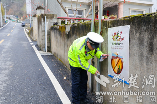 在村口、事故多发路段、文化广场等重点区域,民警悬挂“骑行安全最重要,安全头盔要戴好”“此路段事故多发,请减速观察谨慎通行”等警示横幅;在村务公开栏、小卖部、农家乐等人员密集场所,张贴以案释法的交通安全宣传海报,构建起“抬头可见、驻足即观”的乡村交通安全宣传阵地。