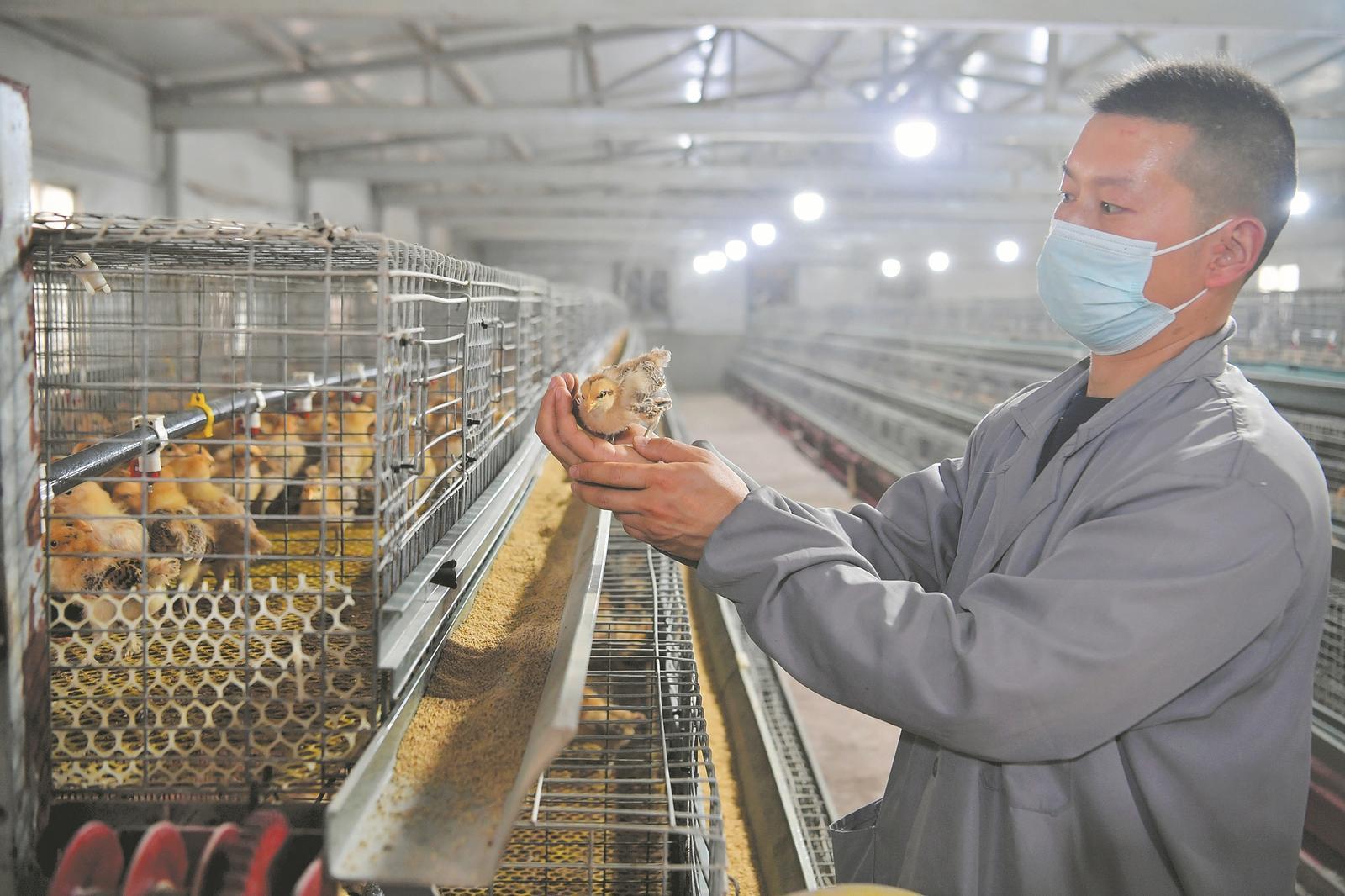 3月18日,在南漳县五官山生态土鸡养殖特色产业基地,养殖人员正在查看土鸡苗生长情况,等到土鸡苗长到半斤重,做好防疫后提供给订单农户养殖。