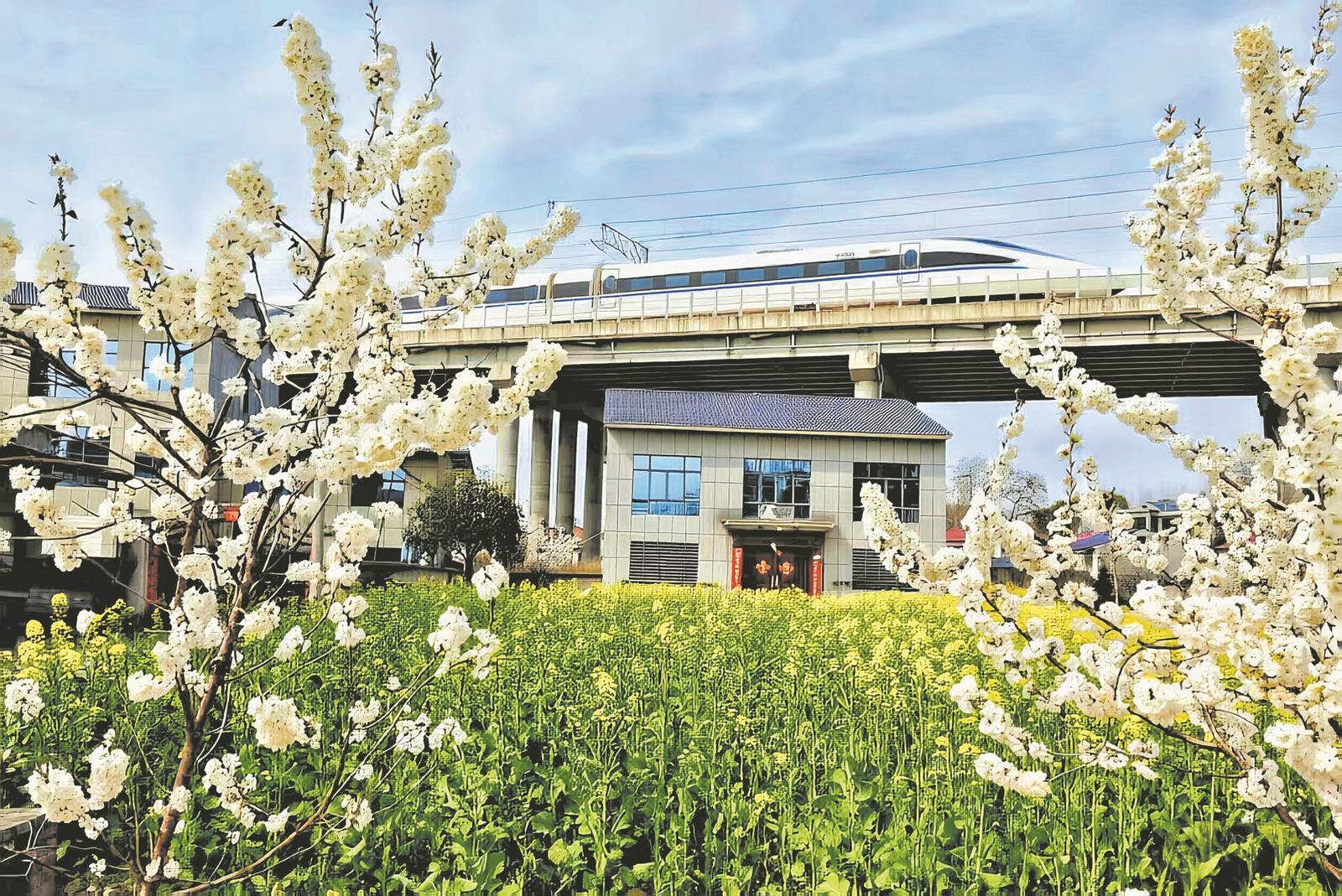 南漳县城关镇榆树岭,洁白的樱桃花与金黄的油菜花旁,一列高铁飞驰而过。通讯员 谢琪 摄