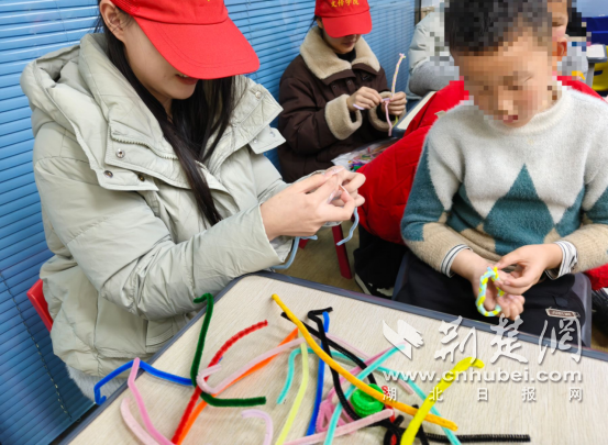 讲解结束后,创意龙制作环节正式开启。志愿者们分组陪伴在孩子们身边,耐心细致地引导他们使用扭扭棒,发挥想象力与创造力,亲手制作形态各异的龙头手工作品。手把手的指导、温柔的鼓励、耐心的陪伴,让孩子们逐渐放开手脚,沉浸在动手创作的乐趣中。在制作过程中,孩子们的手部精细动作得到有效锻炼,创造力与想象力也得到充分发挥,彼此间的互动交流不断增多,活动现场暖意融融、欢声笑语不断,每一份手工作品都承载着孩子们的快乐与志愿者的关爱。