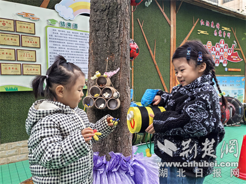 这些满是巧思的作品,都是孩子和老师共同完成的。废旧的易拉罐、纸筒、毛线在孩子们的小手中焕发新活力,让大树成为了生态校园里的生动课堂,更让孩子们在动手创作中感受春日生机,真切体会变废为宝的乐趣。