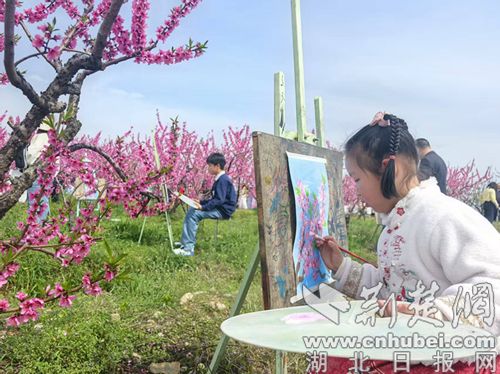 3月28日,在枣阳市熊集镇熊河村优质桃种植区,漫山遍野的桃花沿着山势铺展开来,粉红交错、争奇斗艳。漫步桃林间,市民游客拍照打卡,不少小朋友以花为景,现场作画,用画笔绘就美丽的春天。