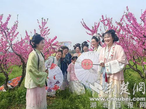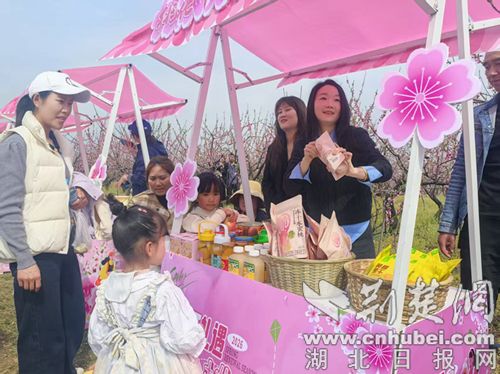 近年来,枣阳市依托当地桃产业资源,不断丰富“赏花+”业态,推动农文旅深度融合,拉动旅游消费。熊集镇以桃花为主题举办“桃花市集”,内容涵盖非遗文化、汉服展示、手工制作、美食小吃等。市集上,小朋友们围坐在一起,用彩泥捏制桃花摆件,白色、红色、黄色的泥团经过简单捏制,变成一个个可爱的桃花造型。一旁的摊主正为小朋友绘制桃花妆,脸蛋上点缀粉红桃花,与春景相得益彰。除了互动体验,市集还汇聚了琳琅满目的桃产品——桃干、桃汁、桃罐头、桃胶等以桃子为原料制作的各类食品,以及桃文化为主题的文创产品,吸引不少游客驻足消费。