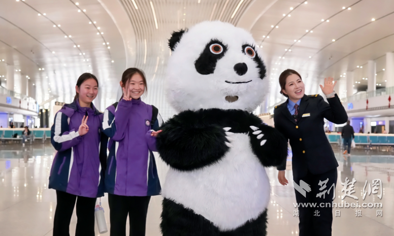 7时许,在襄阳东站前广场上,身着统一校服的孩子们精神抖擞,手持研学手册,在老师的带领下有序进站乘车。一进候车室,憨态可掬的大熊猫玩偶便迎上来,瞬间点燃现场气氛。同学们纷纷围上去与“熊猫”击掌、拥抱并合影留念,候车大厅里充满了欢声笑语。
