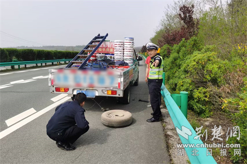 4月11日上午10时10分,宜城市公安局交管大队高速公路中队民警陈灏、辅警黄龙驾驶警车巡逻至麻安高速公路麻安向273公里处时,发现应急车道内停放着一辆小型货车,一穿红色上衣的男子正钻入车底查看情况,当时不少过往车辆从旁驶过,十分危险。
