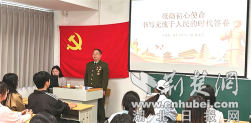 荆楚网(湖北日报网)讯(通讯员 刘俐欧 李双双)4月16日,襄阳市军休一所“红熠”老干部宣讲团成员张美义,受邀走进湖北文理学院外国语学院草庐讲堂,以《砥砺初心使命 书写无愧于人民的时代答卷》为题,为40余名入党积极分子讲授红色思政课,传承红色基因,传递使命担当。
