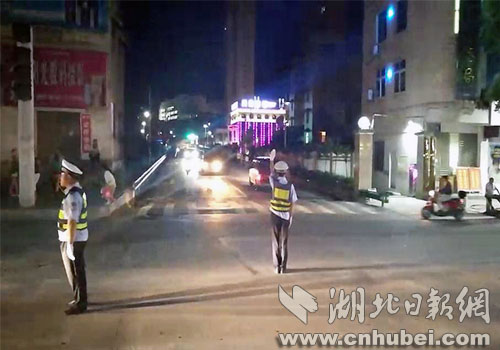 7月18日晚8时许,保康交警正在十字路口指挥交通。图片由通讯员提供