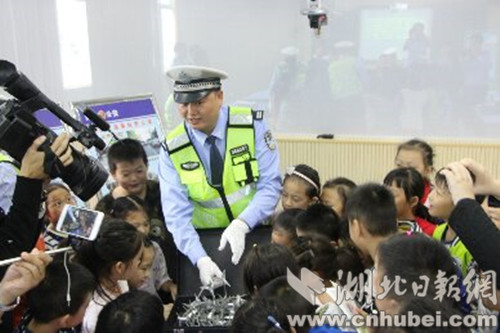 湖北日报网消息(通讯员 梁大伟)为了进一步提高中小学生交通安全意识,预防和减少涉及中小学生的道路交通事故的发生,襄阳市樊城区人民广场警务平台根据省交管局、市交警支队统一安排,于2017年9月5日上午10时-11时,组织民警到襄阳市磁器街小学开展湖北"千名交警进校园"网络直播活动暨秋季学期"交通安全开学第一课"宣传教育活动。