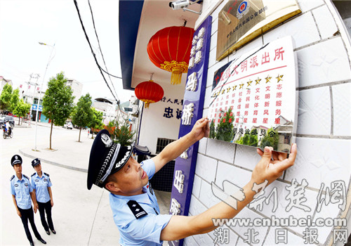 民警在悬挂“十星级文明派出所”匾牌(通讯员 欧阳智慧 摄)