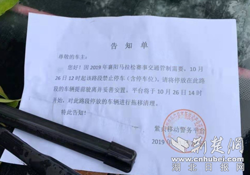这张告知单上写着:“尊敬的车主:您好!因2019年襄阳马拉松赛事交通管制需要,10 月26日12时起该路段禁止停车(含停车位),请将停放在此路段的车辆提前驶离并妥善安置。平台将于10月26日14时开始,对此路段停放的车辆进行拖移清理。特此告知!”。落款是紫贞移动警务平台大队。