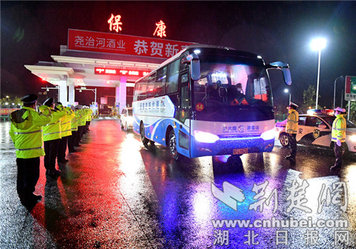 荆楚网客户端—荆楚网消息(通讯员 欧阳智慧)2月15日凌晨,保康县公安局民警列队向辽宁驰援医疗队敬礼。