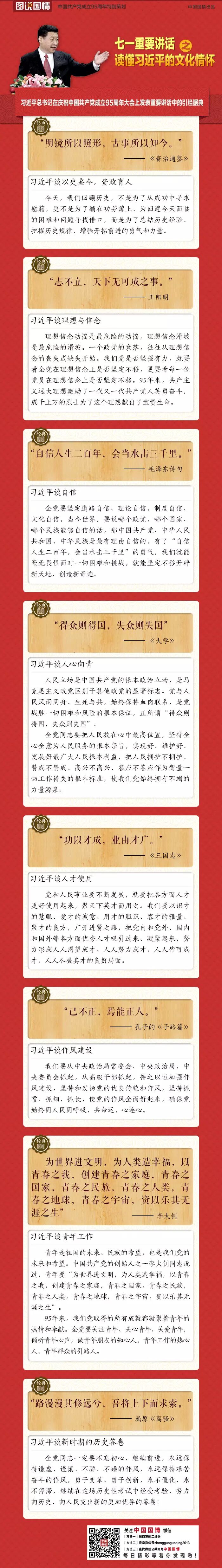 庆祝中国共产党成立95周年大会于7月1日上午10时在人民大会堂举行。中共中央总书记、国家主席、中央军委主席习近平出席大会并发表重要讲话。中国国情为您总结了全文中所有出现的经典名句,我们一起来感受习近平总书记的文化情怀。
