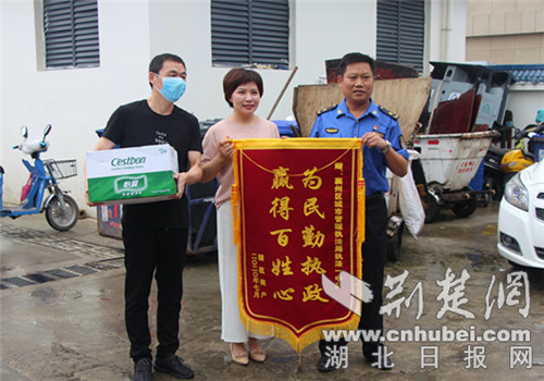 荆楚网客户端—荆楚网消息(通讯员吴佩佩、吕艳)7月16日上午,襄州区城管局执法一中队收到了辖区商户代表送来印有“为民勤执政 赢得百姓心”的锦旗和慰问物资,感谢城管队员在暴雨中的鼎力相助和日常市容管理中的耐心细致。