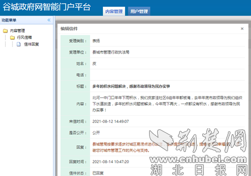 “北河一中门口(谷阳路)年年下雨积水,我们皮家洼6组年年都被淹,去年年底市政领导为我们组织下水道改造,多年的积水问题被解决,今年雨下的再大,一点都没有积水,感谢市政领导为民办实事”。2021年8月14日一皮姓先生在谷城政府网站上这样说。
