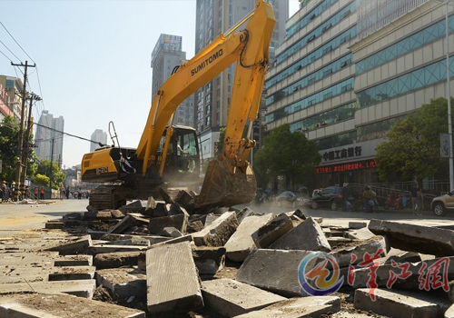 拉美步行街封闭施工,机械入场拆除破损地砖。