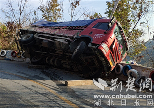 荆楚网消息(通讯员 秦英、陈新才) 11月23日,一辆满载桔子的仓栅式重型货车行驶在十堰市郧阳区209国道,当车辆行至白桑关镇雷锋垭时,车辆不慎当发生侧翻,后被防护栏成功“营救挡护”,避免了车货辆掉入90余米悬崖高度的交通事故,驾驶员、车载货物安然无恙。