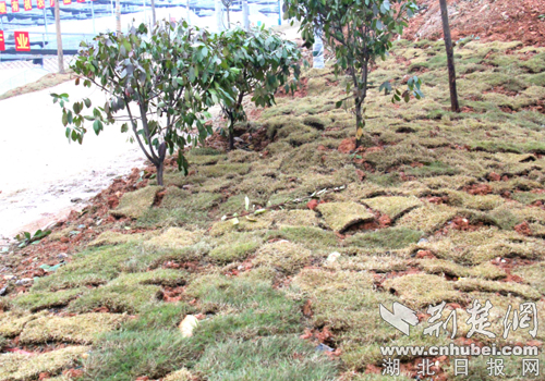 扶贫产业园区新栽的树木、新铺的草皮。通讯员供图