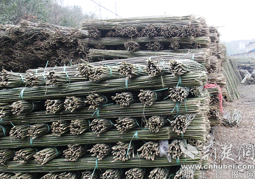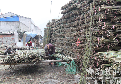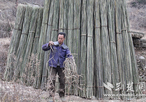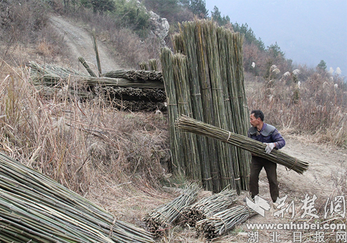 荆楚网消息(通讯员 陈新才)12月21日,湖北省十堰市郧阳区胡家营镇洞沟村三组村民陈本仁,正在整理刚从山上砍回来的野生山竹,准备交售给上门收购的代理商,销往河南、陕西等地,作为发展种植蔬菜使用的“菜架竹”。